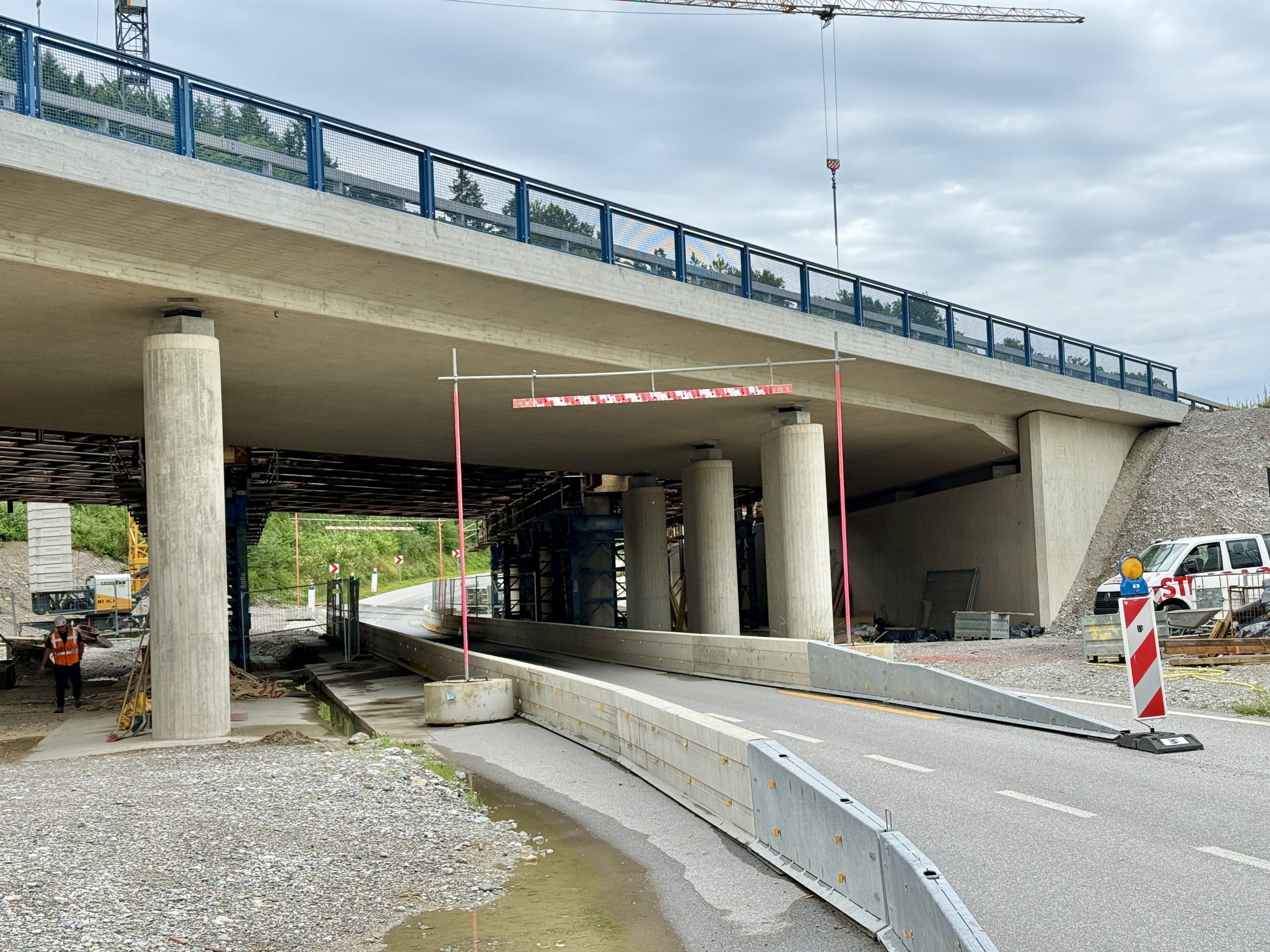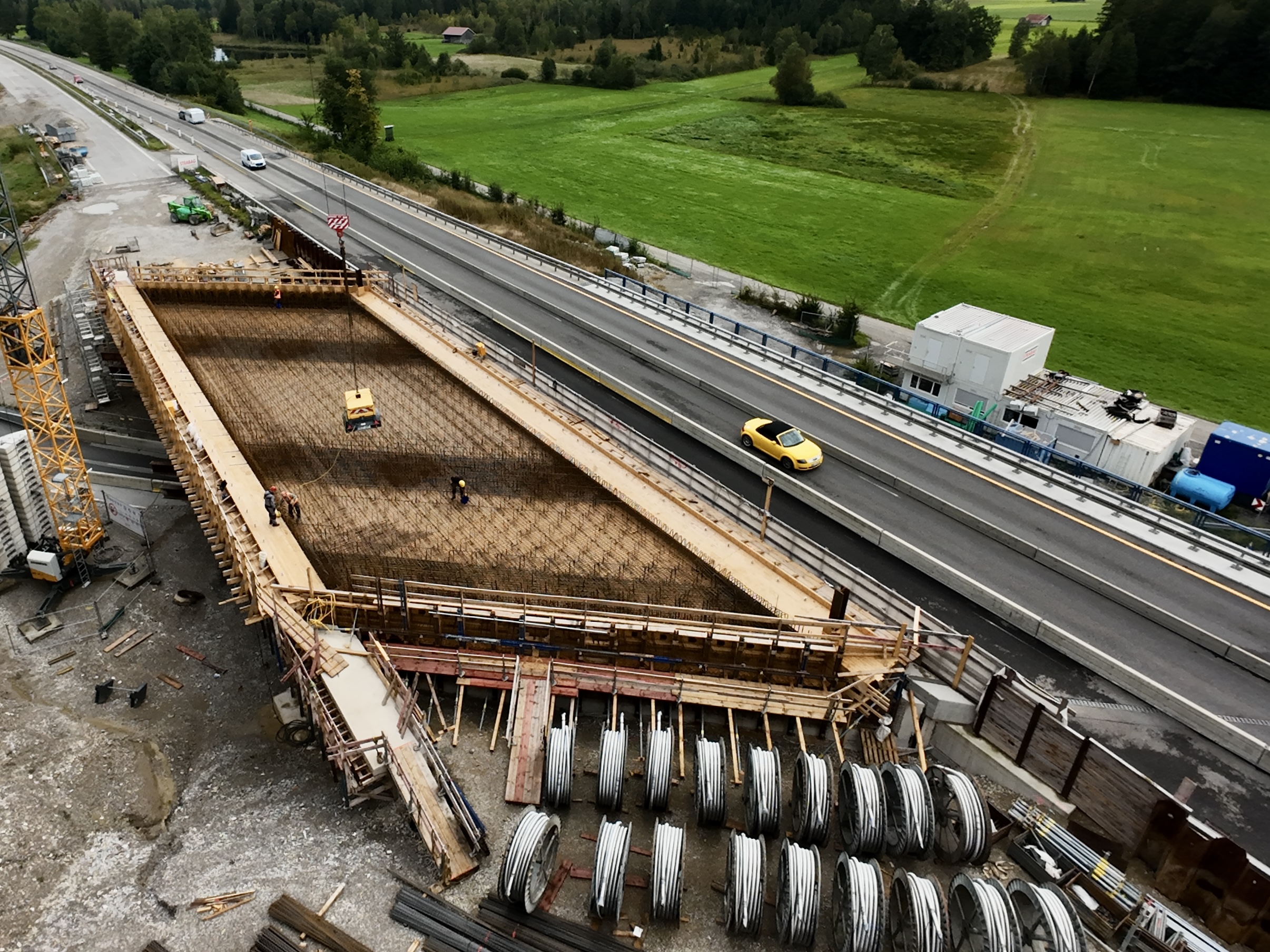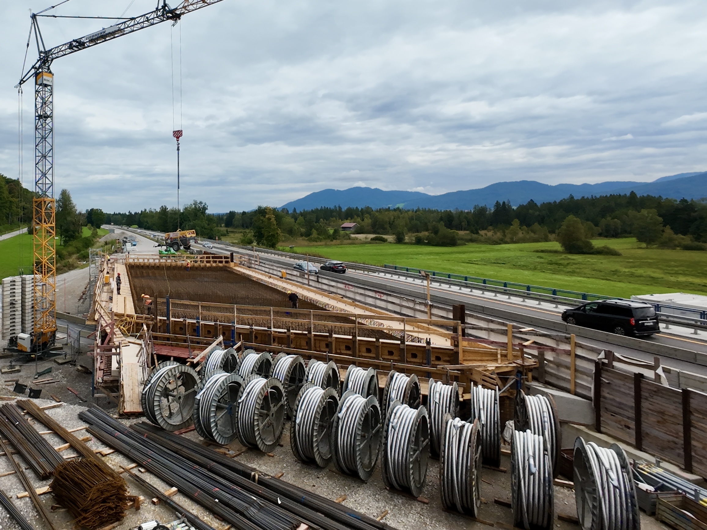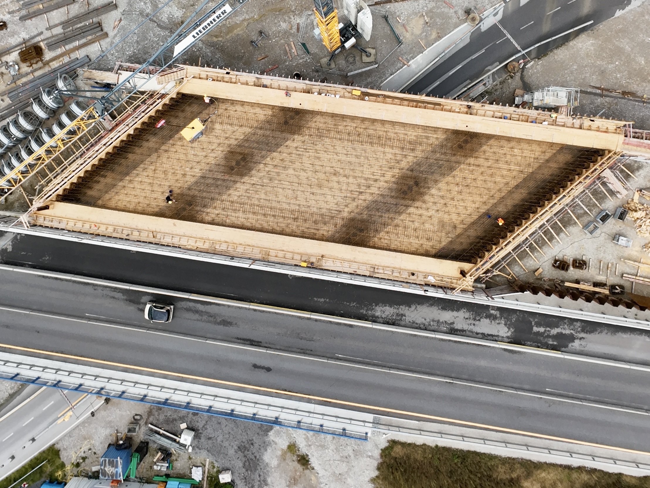 Der neue Überbau wird als vorgespannte Vollplatte mit einer Bauhöhe von 85 cm ausgeführt. Im Bereich der Widerlager sind die Platten gevoutet und erreichen Dicken bis 1,40 m. Zum Einsatz kommt das Litzenspannsystem von Suspa DSI mit 18 Spannsträngen je Überbauplatte.